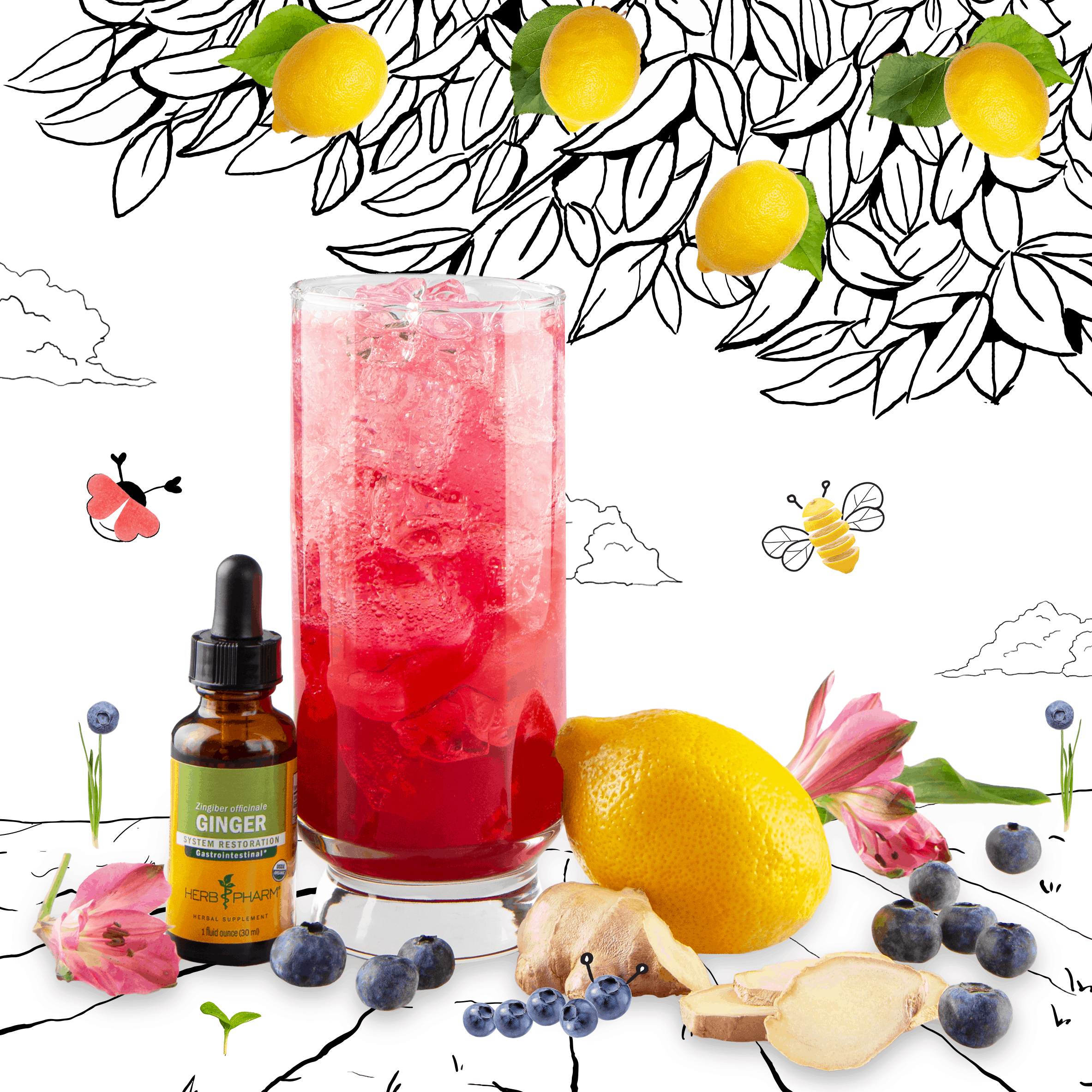 • Fill a glass with ice. Add 2 tablespoons of blueberry simple syrup, lime juice and Herb Pharm ginger liquid extract.